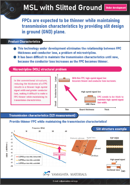 | 23 | Low-loss FPC (GHz band Microstrip line) | PTFE-based + low-dielectric coverlay, PTFE-based + soft resist, transmission loss improved by 60-70% compared to normal products in 40GHz band. Transmission loss of LCP base + low dielectric coverlay, which is easy to handle, is improved by about 50%.